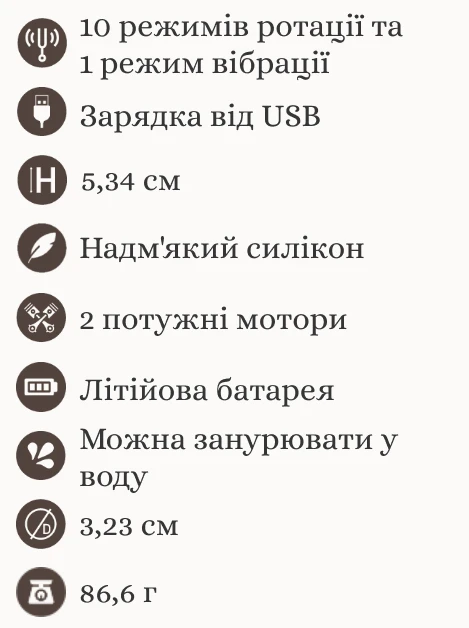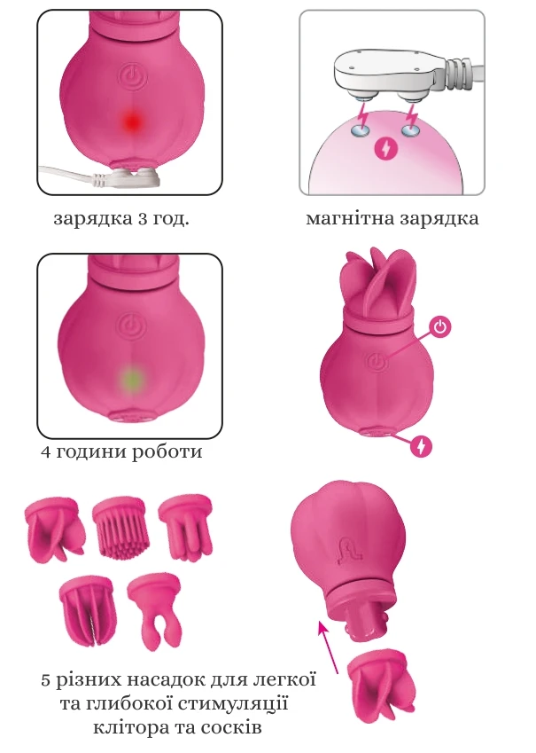 Дизайн секс-игрушки также продуман до мелочей. У неё есть один основной корпус и аж 5 разных насадок, чтобы вы не успевали привыкнуть к одному эффекту. Очень приятный бонус, что помимо разнообразия в форме, были придуманы ещё и 10 режимов вращения, которые с каждой из насадок играют совершенно по новому.