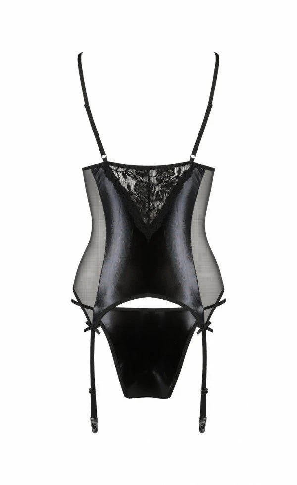 Классический крой корсета сочетается с нежным кружевом и волнующим материалом, имитирующим кожу. Крой корсета подчеркивает талию и приподнимает бюст, создавая красивый и стройный силуэт. Подвязки позволяют дополнить образ чулками (в комплекте не идут). Трусики в комплекте.