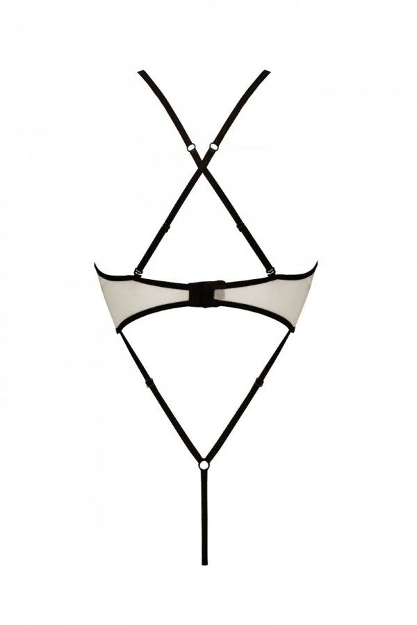 Кружевные получашки на косточках шикарно очерчивают грудь, оставляя на виду аппетитные части и лишь слегка пряча соски. Для лучшей посадки бретели лифа можно отрегулировать. Экстравысокие вырезы по бокам обнажают бедра и часть талии. Спинка боди максимально открыта: тут есть только застежка лифа, перекрещенные бретели и регулируемые ремешки условных трусиков. Открытая промежность — как сладкий сюрприз этого потрясающего белья.