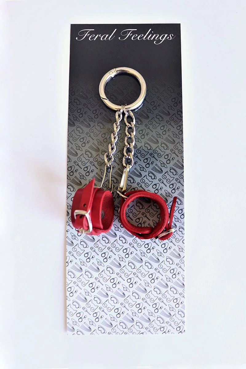 Миниатюрная версия наручников изготовлена из натуральной кожи растительного дубления. Каждый наручник крепится к основному кольцу-карабину цепочкой и мини-карабином, поэтому можно носить только один наручник, а второй — подарить своему партнеру в качестве символа.