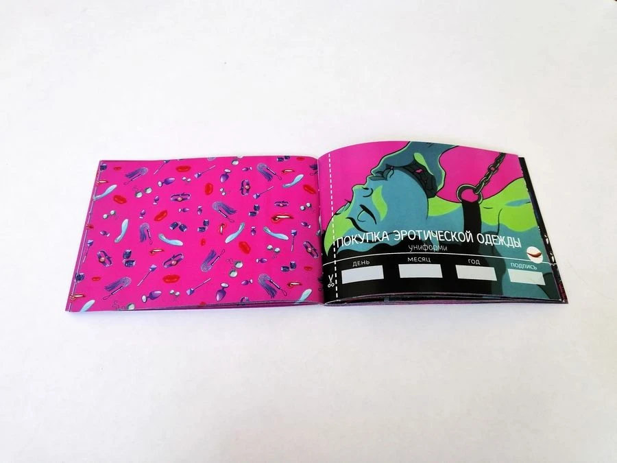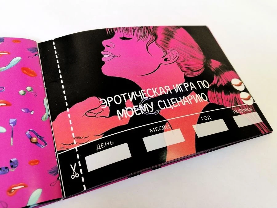 30 чеков самых разных сексуальных фантазий и желаний, которые разнообразят вашу интимную жизнь. Это пожалуй, лучший подарок для обеих партнеров, так как обе стороны останутся удовлетворенными. Слоган книжки звучит так "от поцелуев, до полного повиновения..." Докажите, что ради своего любимого человека вы готовы пройти этот путь.