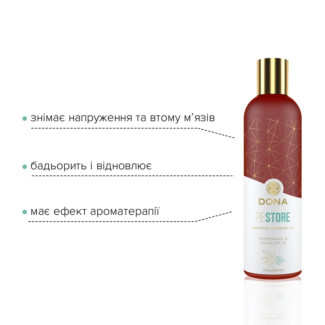 Базовое массажное масло с добавлением эфирных масел Essential Massage Oil Dona by JO Restore - Peppermint & Eucalyptus - это уникальная смесь натурального базового масла и эфирных масел. Базовое масло обеспечивает идеальное скольжение, питает и увлажняет кожу, а натуральные эфирные масла позволяют добиться определенного терапевтического эффекта, добавляют приятный аромат (ароматерапия), расслабляют и тонизируют кожу. Отлично подходит для снятия напряжения и усталости мышц. Подходит для любого типа кожи.