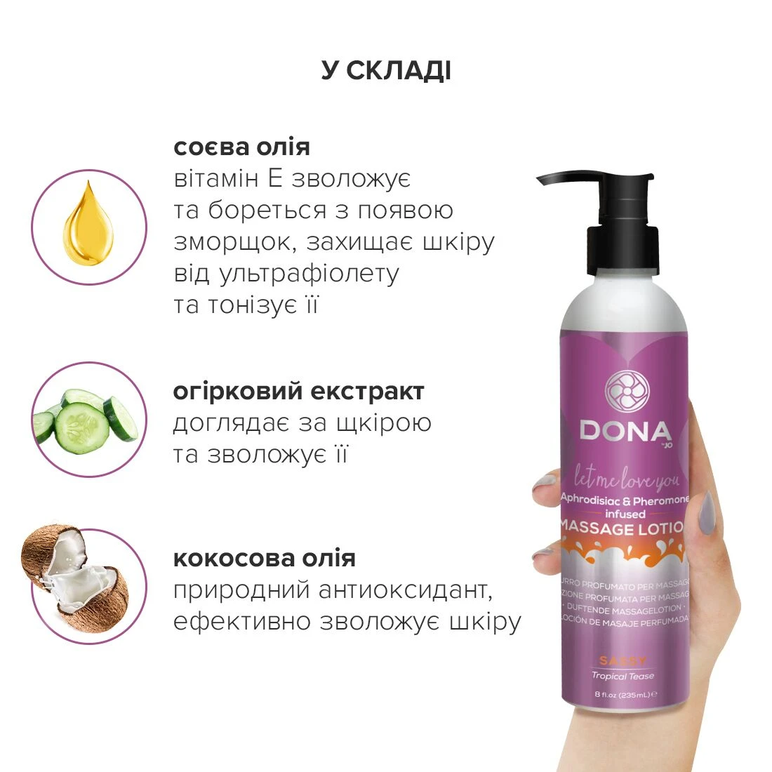 Добавьте своей кожи мягкости и соблазнительного благоухания с ароматическим увлажняющим массажным лосьоном Dona Massage Lotion Sassy Aroma Tropical Tease "Страсть". Пьянящая смесь афродизиаков, феромонов и притягивающих ароматов сделает Вашу кожу неотразимой, безупречно гладкой, шелковистой, зовущей к чувственным прикосновениям. Нежный, нежирный лосьон для тела увлажняет, питает и омолаживает кожу. Наполнен лучшими ингредиентами разжигающими страсть. Легкие массажные движения любящих рук выражают заботу. Пусть Ваша кожа будет всегда свежей, мягкой, молодой и красивой!