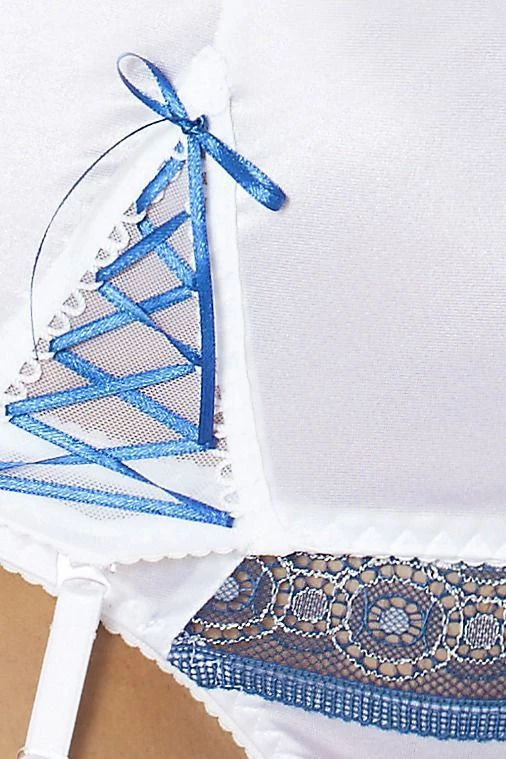 Плотный корсет подчеркивает достоинства фигуры, утягивая ее и делая еще более привлекательной. Голубой кружевной лиф - главный акцент корсажа, который, равно как и трусики, подчеркивает наиболее сладостные источники наслаждений.