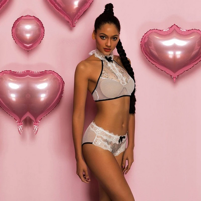 Рекомендуем купить кружевной эротический комплект с топом — красивый набор из кружевных игривых трусиков и стильного топа с поддерживающими чашечками. Топ украшает кружевной чокер, а контрастные бантики выглядят привлекательно и маняще.