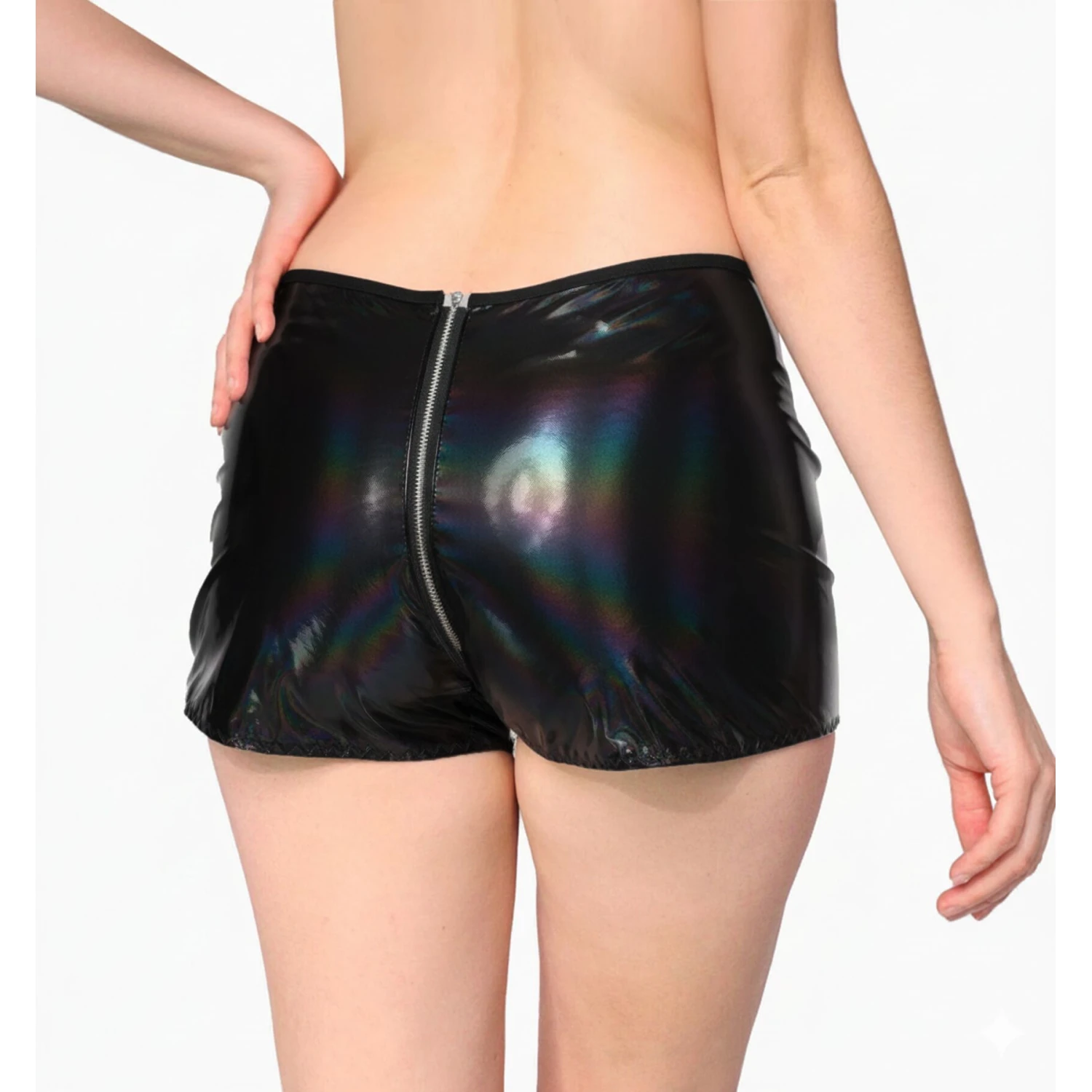 Эти шортики созданы для смелых образов и уверенного настроя. Гладкая лакированная поверхность с голографическим переливом эффектно отражает свет, меняя оттенки под разными углами и подчёркивая каждое движение.