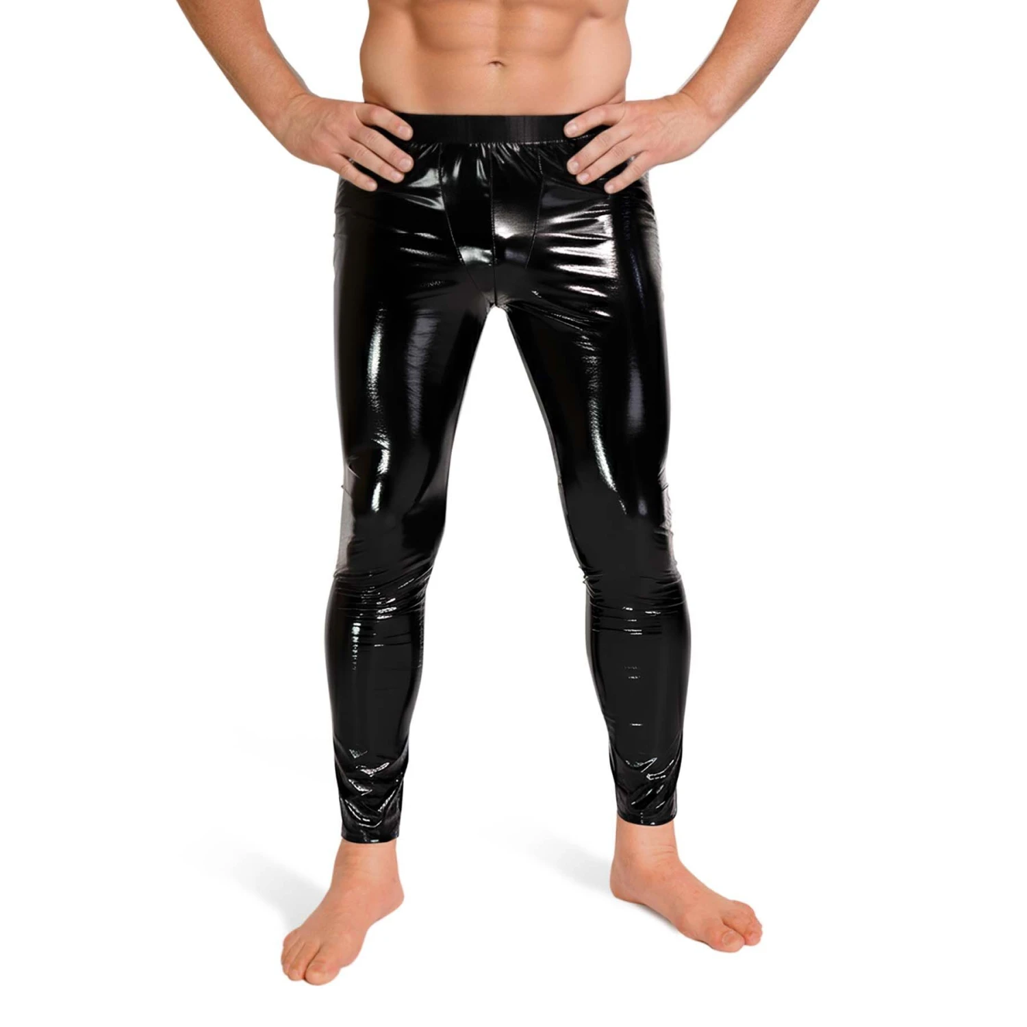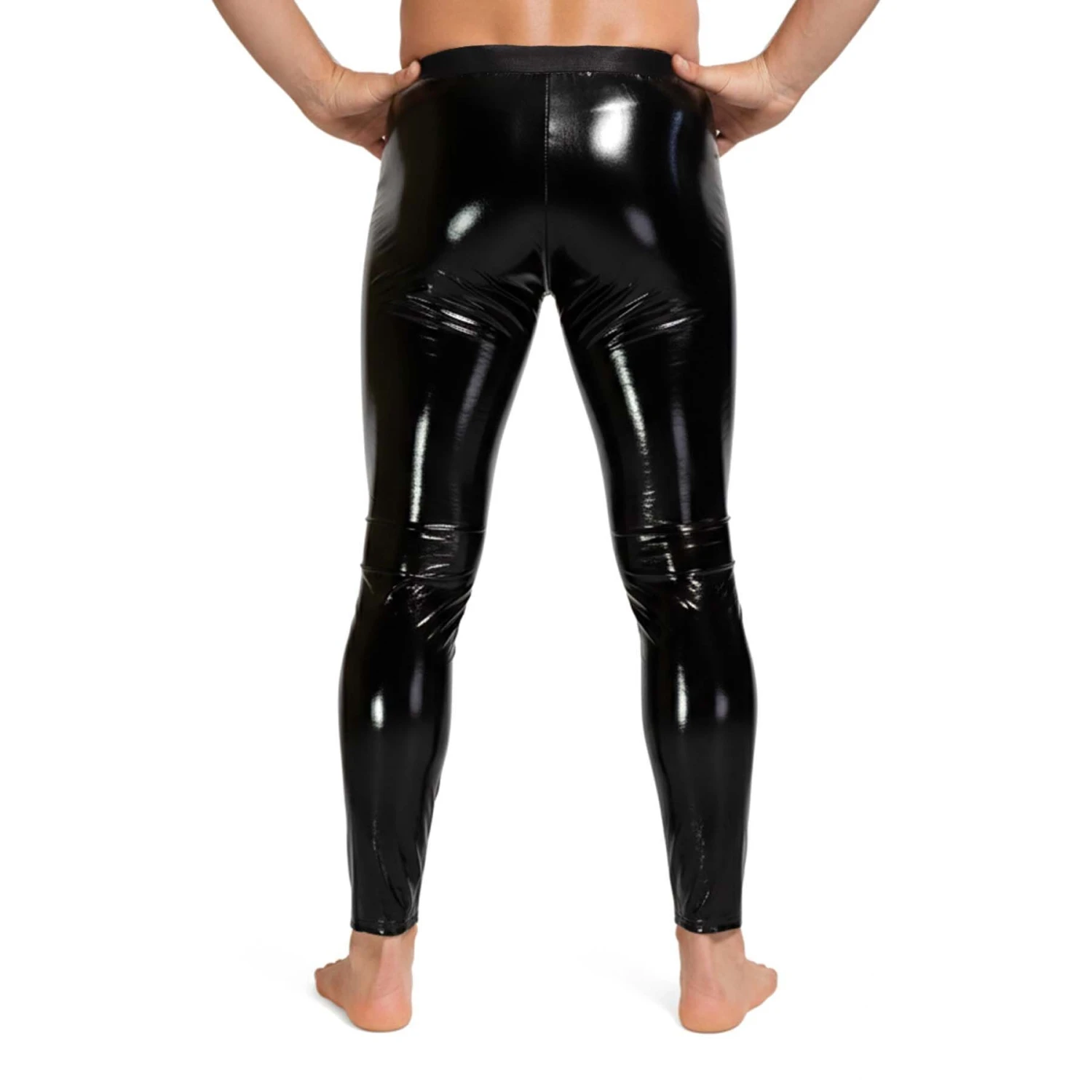 Эластичный винил премиум-класса плотно облегает фигуру, обеспечивая посадку «второй кожи» без ограничения движений. Глубокий чёрный цвет с зеркальным глянцем интенсивно отражает свет, подчёркивая рельеф мышц ног и бёдер.