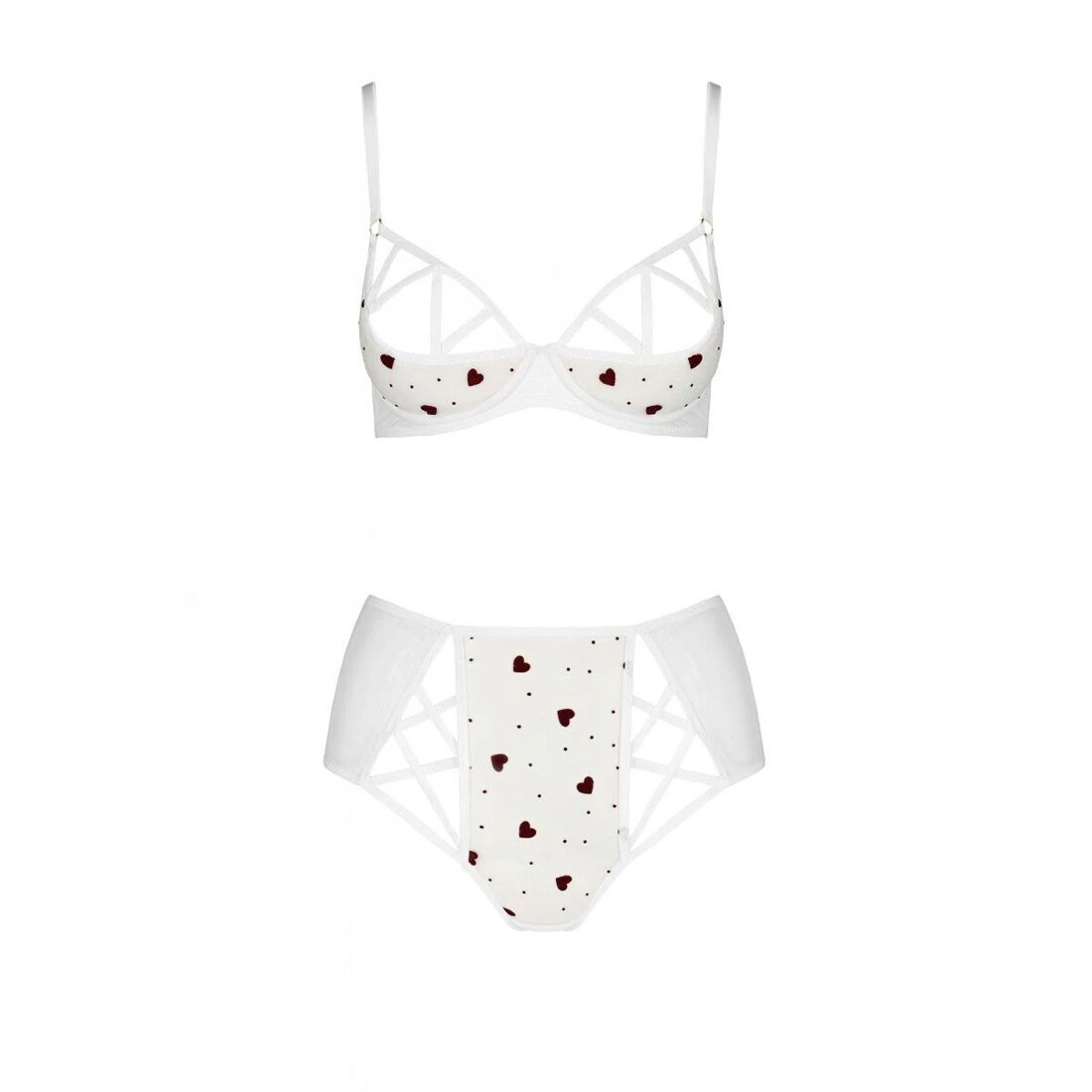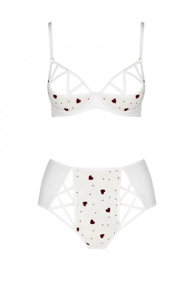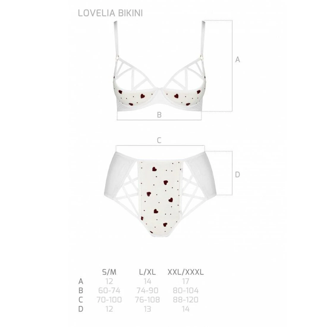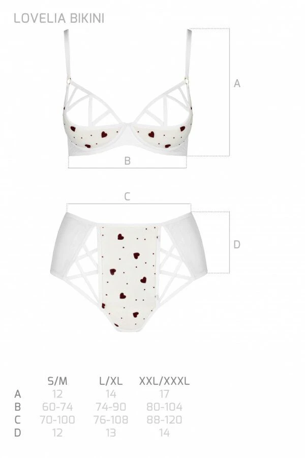 Невероятно романтическое белье с трендовыми высокими трусиками! Предлагаем купить эротический комплект с рисунком LOVELIA BIKINI white XXL/XXXL — Passion: трусики с высокой посадкой и полуоткрытой попкой плюс бюстгальтер на косточках с жесткой получашкой. Такая конструкция белья подчеркивает талию, высоко поднимает грудь и создает волнующую линию декольте. Нежные сердечки дополнительно украшают белье.