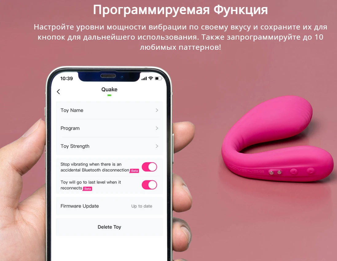 У двойного вибратора Dolce (Quake) есть приложение, которое подарит вам отличные оргазмы. Чтобы насладиться полным спектром режимов и получать удовольствие от разных паттернов и комбинаций, рекомендуем установить приложение Lovense Remote. В приложении вы найдете множество способов развлечься, сможете запрограммировать около 10 паттернов под себя, насладиться игрой в ритм музыке или перейти на голосовое управление. Подключиться к приложению Lovense Remote можно через Bluetooth или интернет.