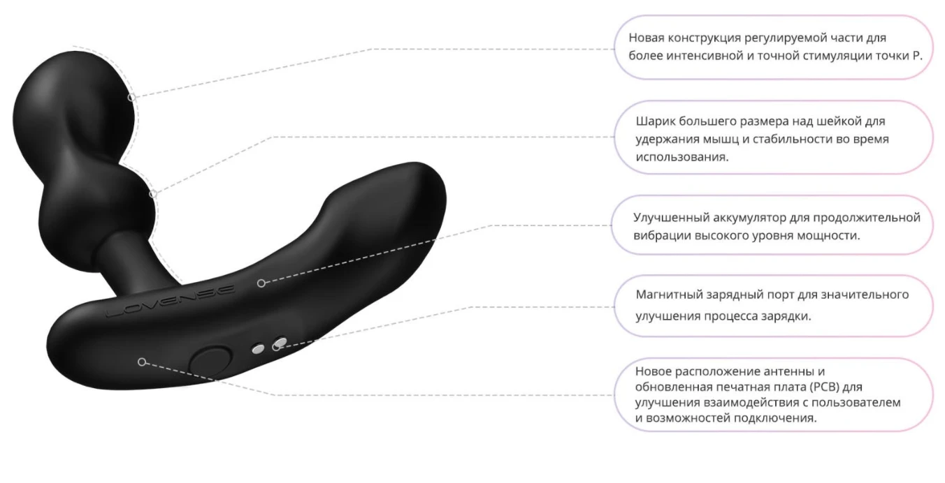 Один из моторов размещен в головке для стимуляции простаты, второй моторчик находится в уплотненной части, чтобы мягко стимулировать промежность. Головка отвечает за точечное влияние на простату.