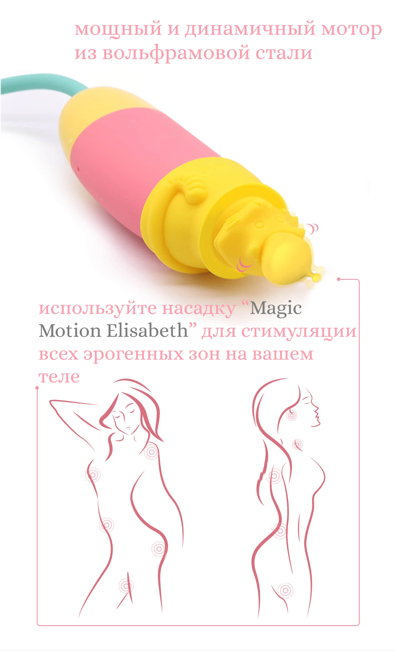 А для ещё более раскованных и желающих попробовать что—то необычное, рекомендуем приобрести специальную милую насадку в виде котика, Elisabeth: ее слегка заостренный кончик будет точечно воздействовать на все укромные места вашего тела. Попробуйте ее на сосках, клиторе или просто проведите по животу — это очень мягкие и необычные ощущения!