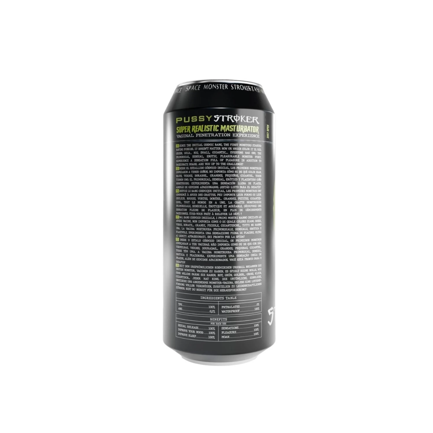 Мастурбатор Alive Pussy Stroker Monster — яркий и ироничный девайс для мужчин, который сочетает функциональность, необычный дизайн и высококачественные материалы. Его корпус стилизован под банку энергетического напитка, что делает использование и хранение максимально дискретным и одновременно оригинальным.