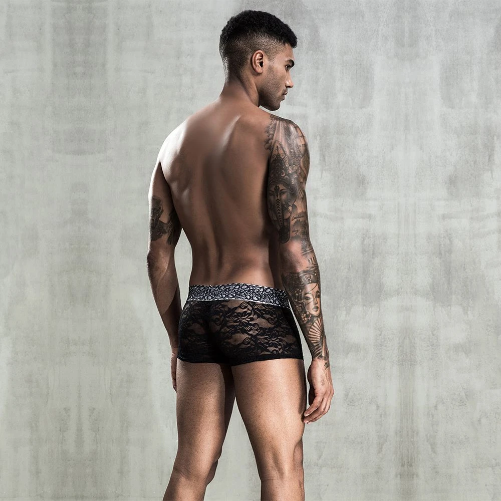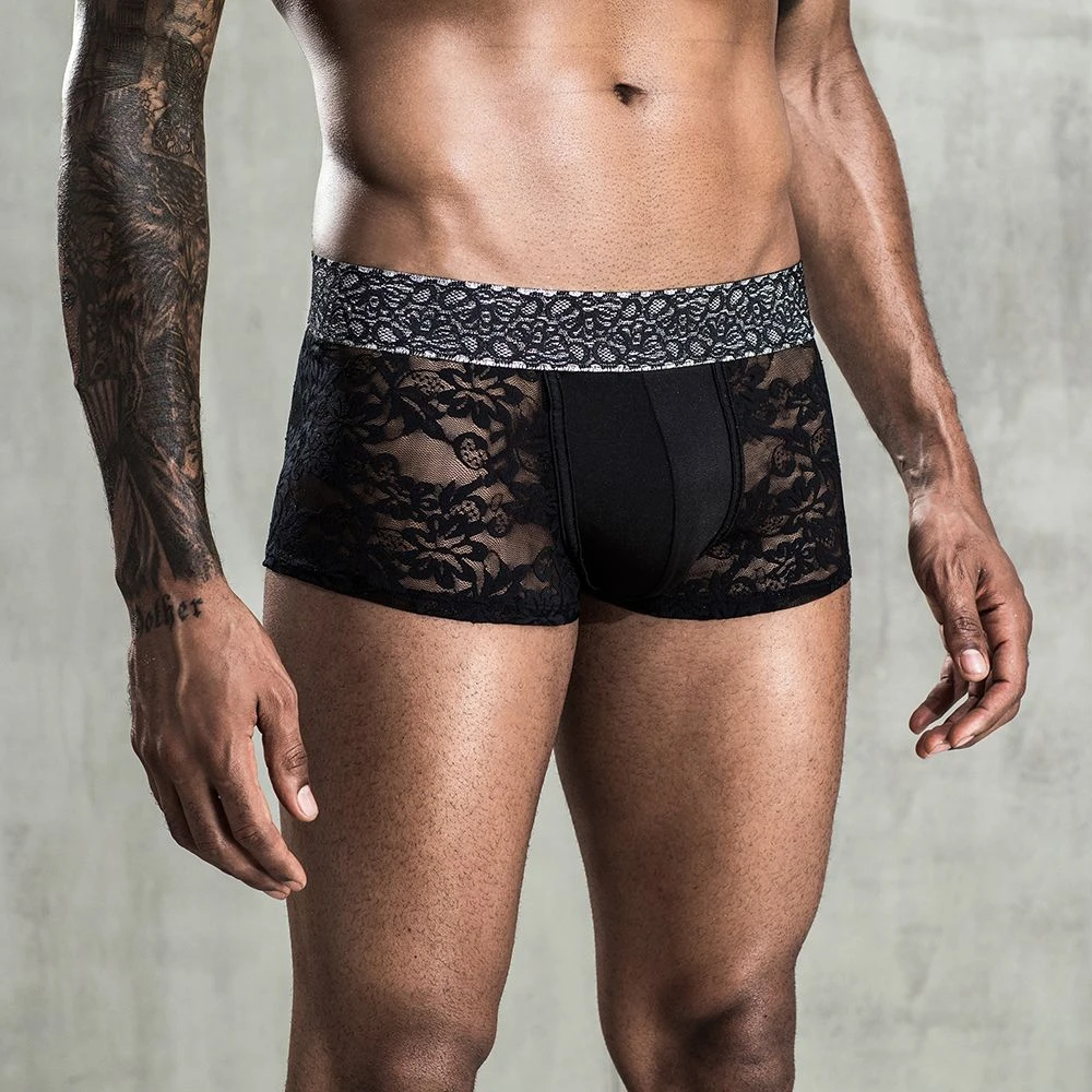 Широкий пояс мужских кружевных трусов боксеров обеспечивает удобную посадку.