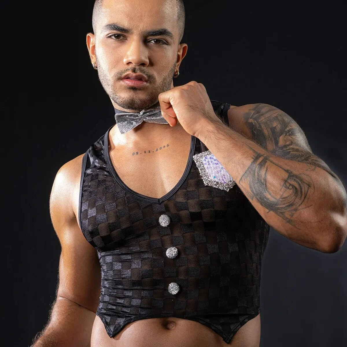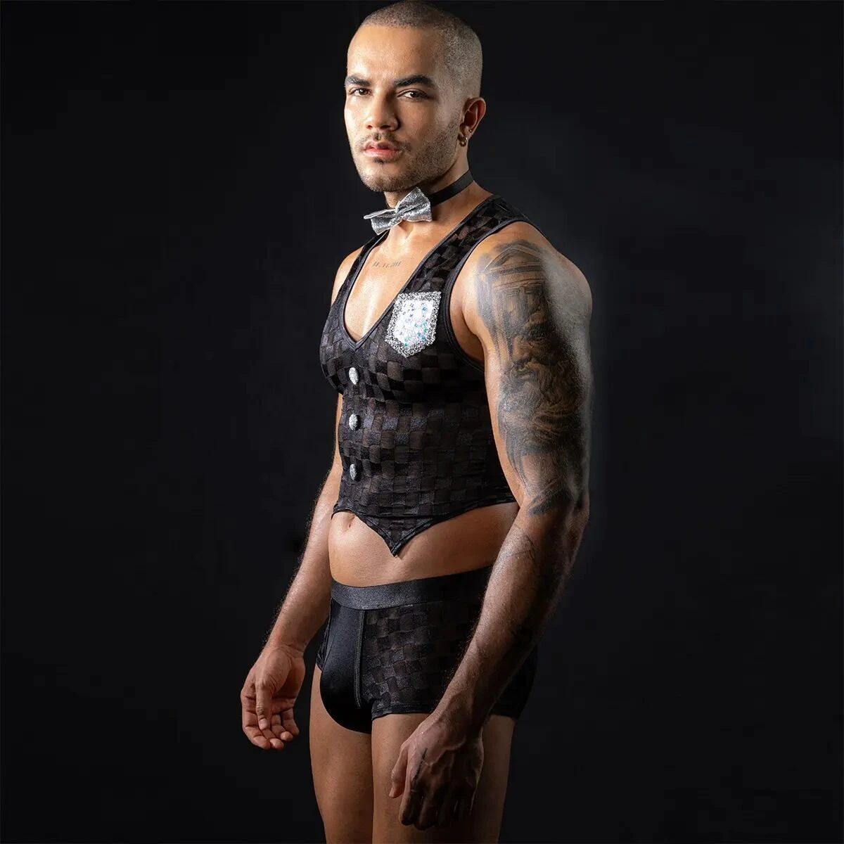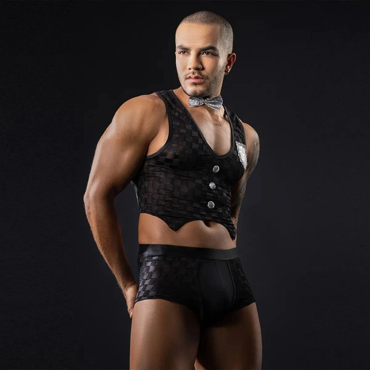 Этот симпатичный молодой человек готов предложить вам горячее меню и сладкие десерты, стоит вам поманить его пальчиком. Рекомендуем купить мужской эротический костюм официанта «Обаятельный Михаэль», чтобы скорее сделать свой изысканный заказ. Топ внешне выглядит как жилет дорогого костюма. Он плотно облегает фигуру, красиво обнажая грудь и живот. Трусы-боксеры подчеркивают попку и бедра. Симпатичный серебристый галстук-бабочка на кнопке добавляет костюму элегантности.
