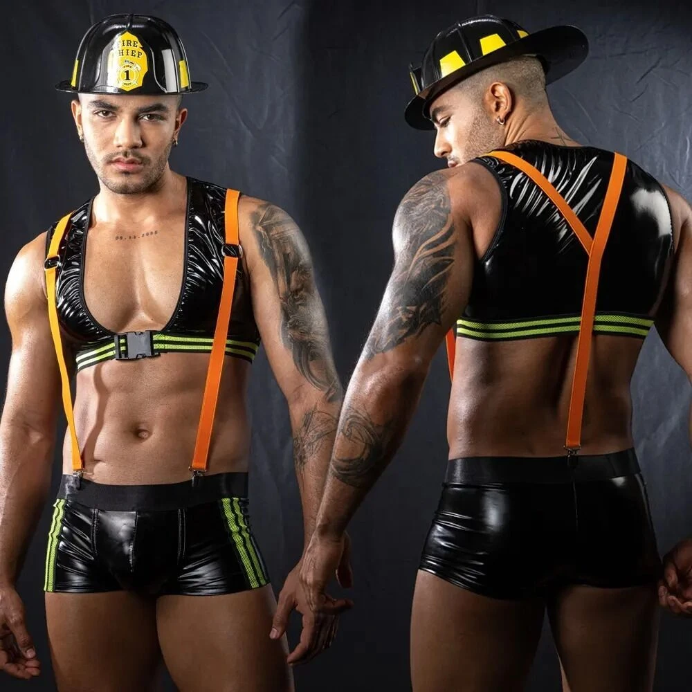 Костюм сшит из блестящей «мокрой» ткани. Топ с низким вырезом практически не закрывает торс. Грубая застежка спереди и широкая резинка в яркую салатовую полоску добавляют образу жесткости и мужественности. Шорты-трусы на широкой резинке идеально садятся на ягодицы и интригующе очерчивают все интимные места партнера. Ярко-оранжевые подтяжки контрастными полосами ложатся на части костюма и тело, неизменно привлекая внимание. Круглая каска с полями очень гармонично завершает стильный образ.