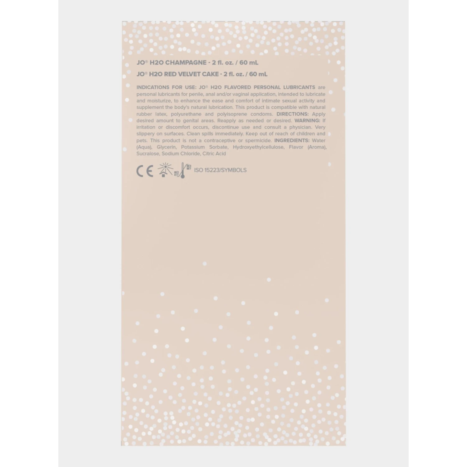 Состав JO Champagne & Red Velvet Cake: Water, Glycerin, Potassium Sorbate, Hydroxyethylcellulose, Flavouring, Flavoring, Sucralose, Sodium Chloride, Citric Acid.