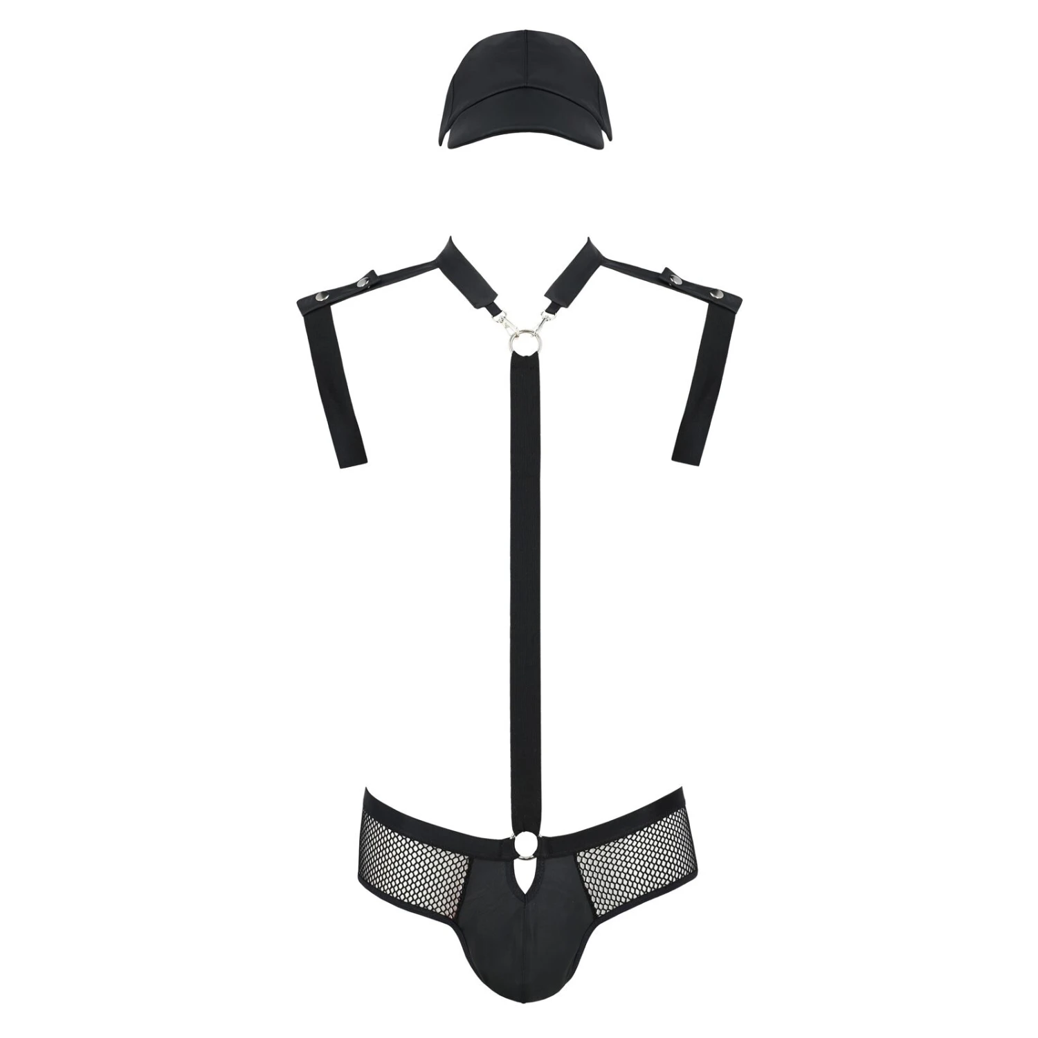 Этот стильный комплект, пошитый из мягчайшей экокожи и широких резинок, оценят любители сексуальных игр и любовных приключений. Трусики-слипы выполнены из экокожи и сетки, ягодицы открыты. Мягкие ремни красиво ложатся на тело, подчеркивая мужественность и страстность, а псевдопогоны и кепка навевают мысли о сильном полицейском. А вот кнопки, колечки и карабины напоминают, что сильный полицейский может быть еще и чертовски сексуальным.