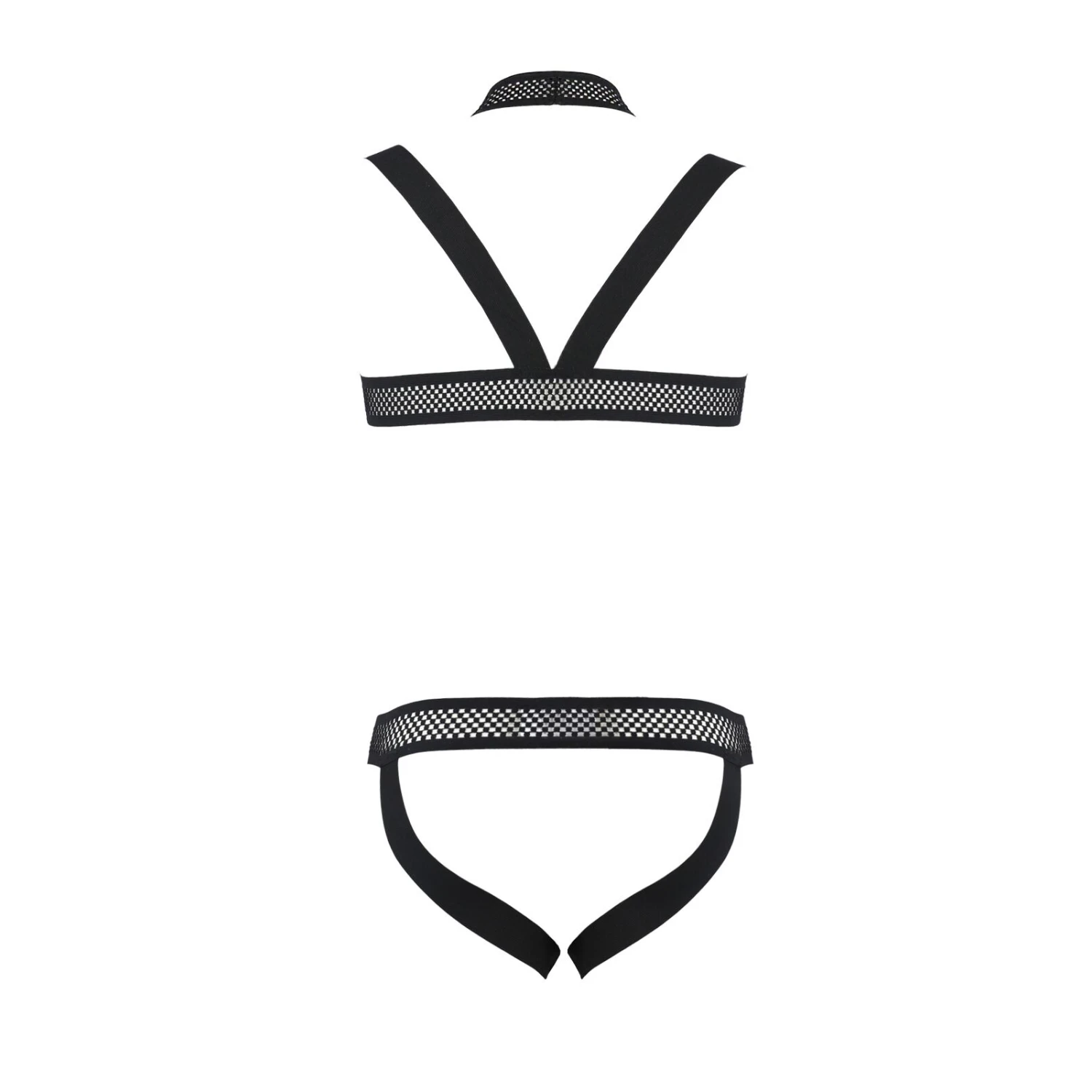 Комплект состоит из трусиков со шлейками. Выполнен комплект из мягкой экологической кожи и эластичной сетки. Сзади трусы соблазнительно открывают ягодицы.