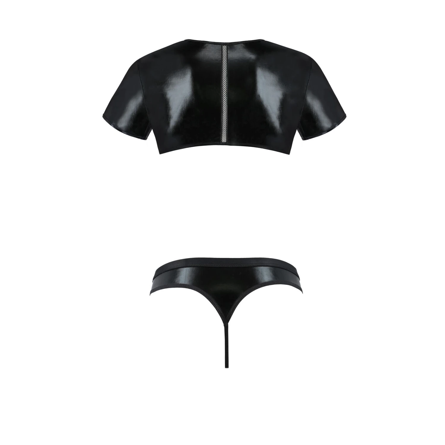 Комплект мужского белья под латекс Passion Set Peter изготовлен из мягкого легкого материала с «мокрым» эффектом. Это кроп-топ, прикрывающий соски, и классические стринги. В топе спереди и сзади есть вставки из симпатичной мягкой сетки, стринги спереди украшены сеточкой, которая немного приоткрывает тайну их содержимого.