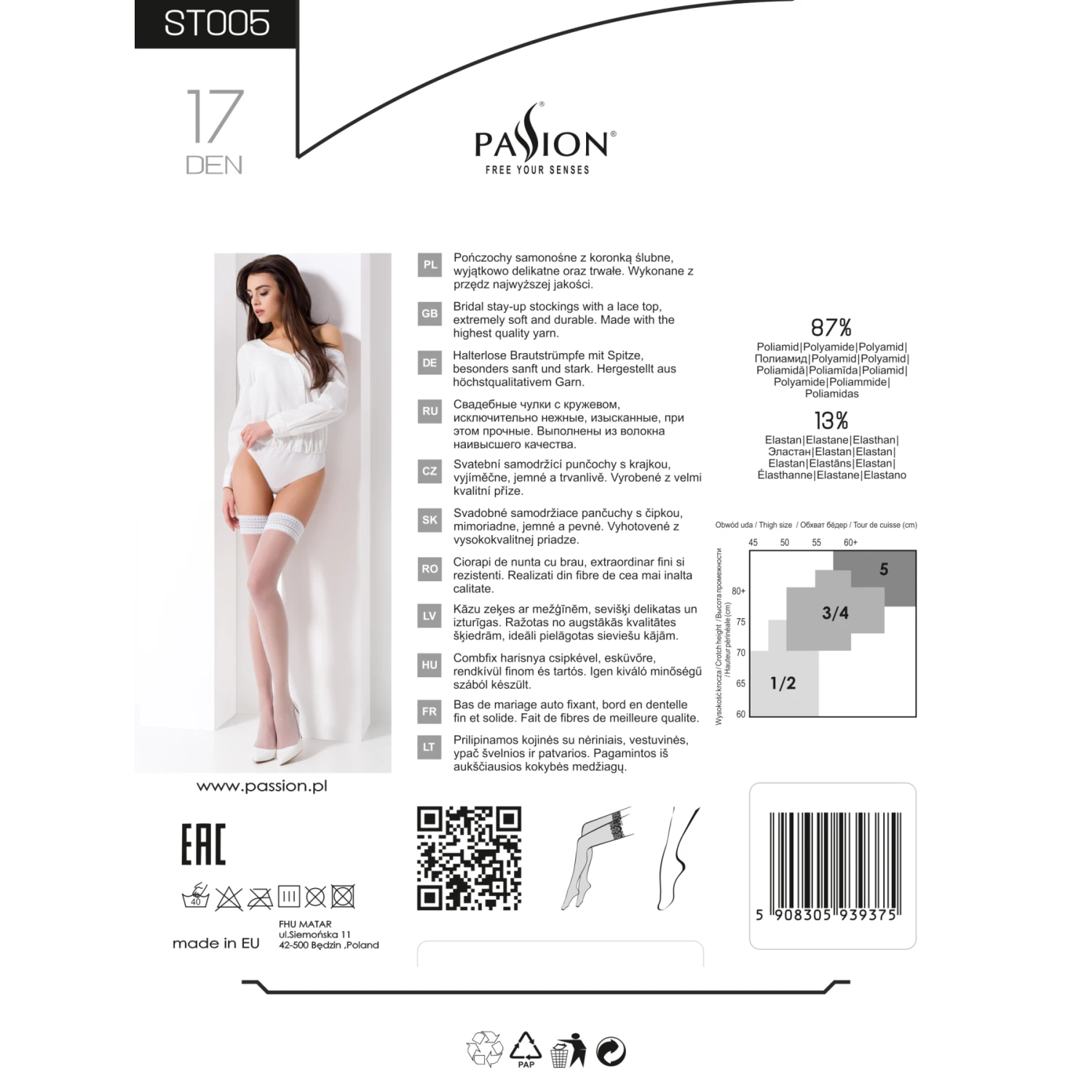 У нас на сайте вы можете купить свадебные чулки производства популярного европейского бренда Passion. Каждая невеста хочет быть самой красивой в знаменательный день своей свадьбы. И даже незначительные, на первый взгляд, аксессуары могут превратить ваш образ в поистине королевский. Без сомнений, таким аксессуаром являются свадебные чулки ST005 bianco. Они выглядят очень нежно и изысканно. Резинка свадебных чулок декорирована лаконичным кружевом, а три силиконовые полоски гарантируют надежную посадку и фиксацию на ножках. За счет этого вам не придется дополнительно приобретать пояс или переживать, что чулки сползут в самый неподходящий момент.
