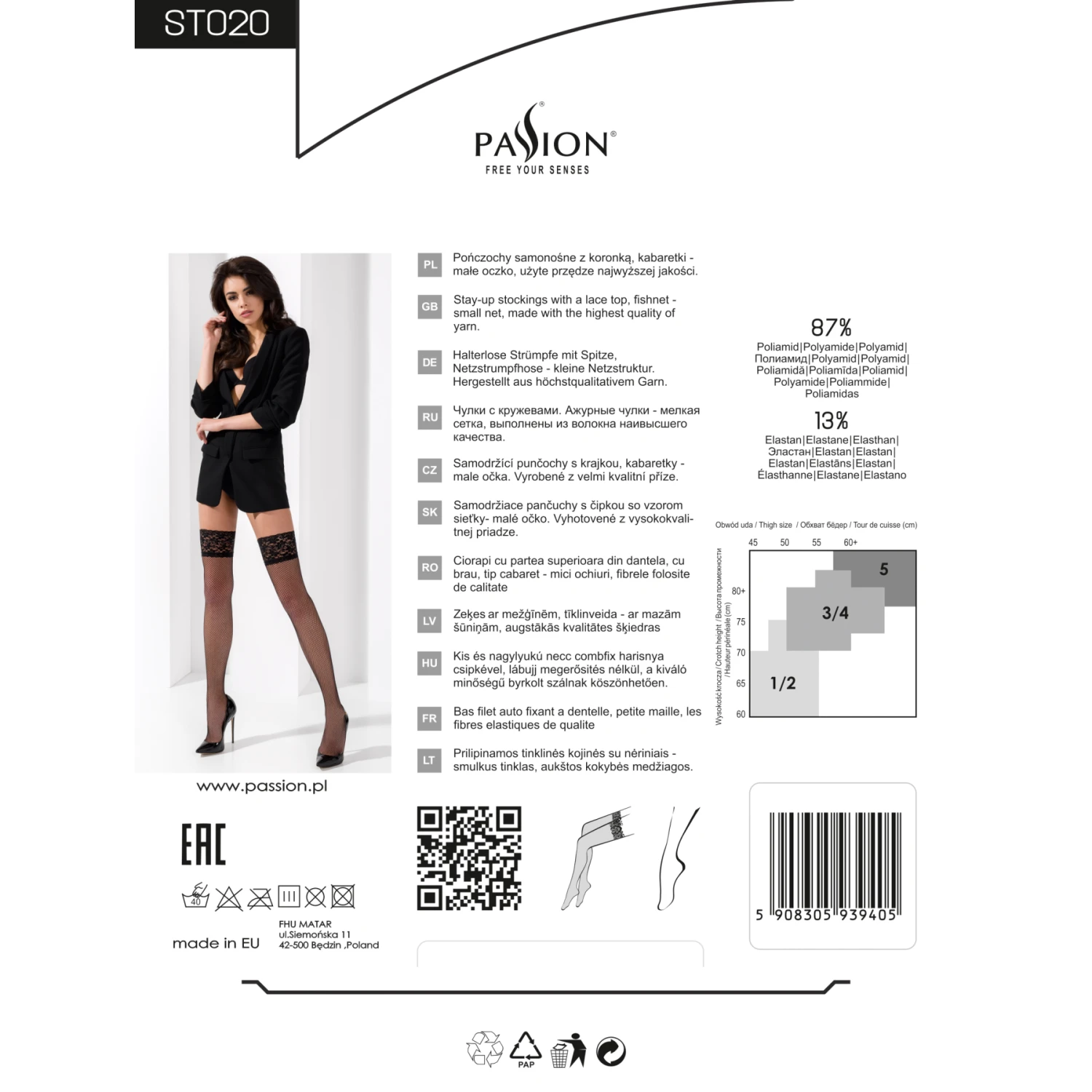 В нашем магазине вы можете купить чулки в сетку от европейской компании Passion. Модель ST020 nero станет пикантной изюминкой, добавляющей сексуальности вашему образу. Черная мелкая сетка идеально облегает ножки и приковывает к себе взгляды. Самоподдерживающаяся резинка с двумя широкими силиконовыми вставками обеспечивает надежную фиксацию чулков на бедрах даже без использования пояса.