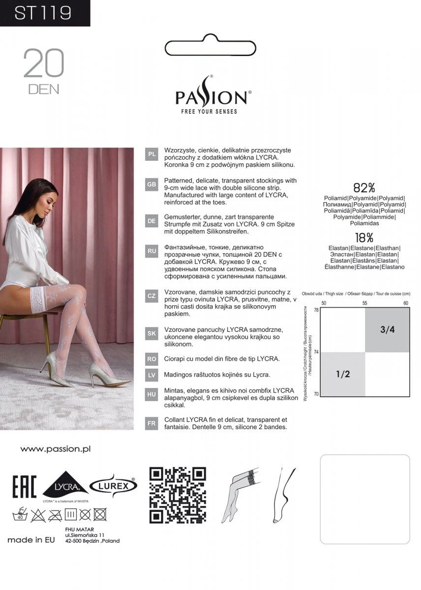 Чувственная деталь, которая способна привнести сексуальный подтекст в любой стиль одежды. Купите чулки Passion ST119 1/2 белые, на ажурной силиконовой резинке, с цветочным декором и люрексовой нитью, облачите ваши ножки в нейлоновую роскошь. Кружевная широкая резинка на двух силиконовых лентах обеспечивает надежное крепление на теле. Многообразный орнамент из россыпи цветов с металлизированной нитью и тонкой полоской под резинкой, имитирующей подвязку, наполняют образ женственностью и изяществом.