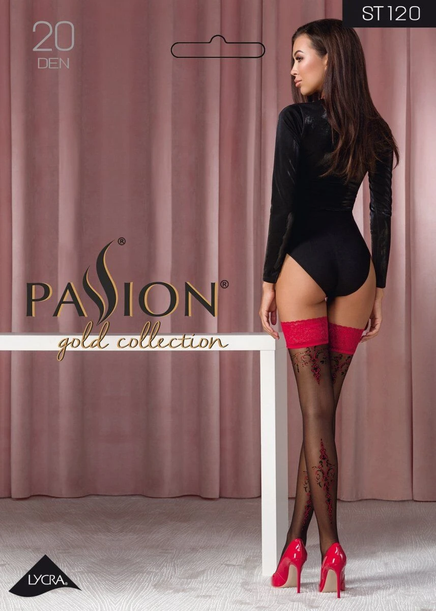 Продемонстрируйте высший пилотаж женственности, нежности и легкости, купите чулки Passion ST120 5 черно-красный, на ажурной силиконовой резинке, с изысканным декором и люрексовой нитью.