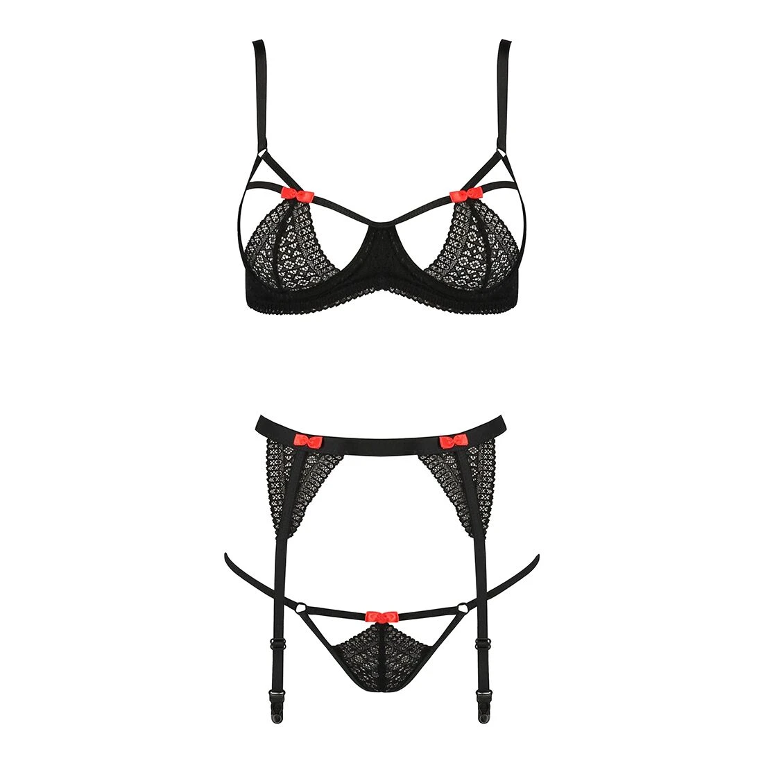Ажурный, смелый и нарядный — рекомендуем купить комплект PERDITA SET black S/M - Passion Exclusive, если вы ищете что-то особенное. Очаровательное кружево, ремешки и бантики вместе создают невероятно возбуждающую гармонию. В наборе — бюстгальтер, стринги и подвязки для чулок.