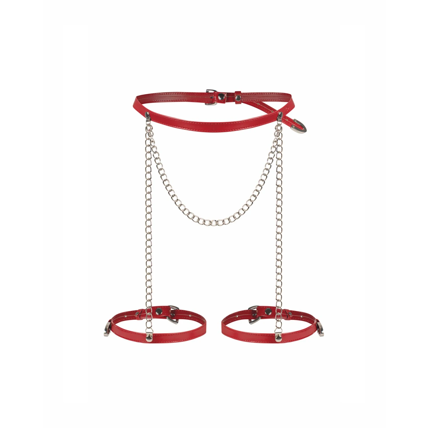 Изготовлен из насыщенной красной экокожи, пояс имеет многослойную конструкцию, подчеркивающую талию. Два параллельных ремня визуально делают силуэт стройнее, а изящные серебристые цепочки соединяют пояс с подтяжками на бедрах, добавляя образу элегантной дерзости.