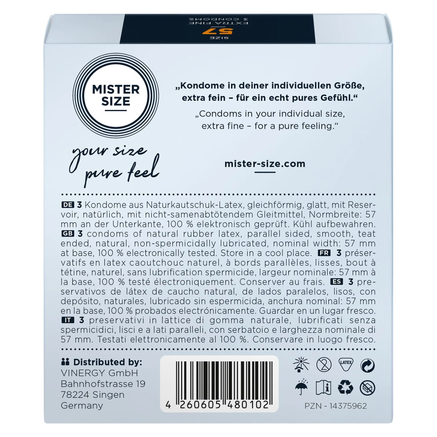Презерватив без презерватива — только естественные ощущения во время близости! Предлагаем купить презервативы Mister Size - pure feel - 57, изготовленные из тончайшего каучукового латекса. Толщина стенок презерватива всего 0,05 мм, при этом он достаточно прочный, чтобы не порваться в ответственный момент, что обеспечивает надежную защиту от нежелательной беременности и ЗППП. Презервативы покрыты силиконовой смазкой, легко надеваются и снабжены понятной иллюстрированной инструкцией. Главное, правильно подобрать размер и наслаждаться качественным сексом!