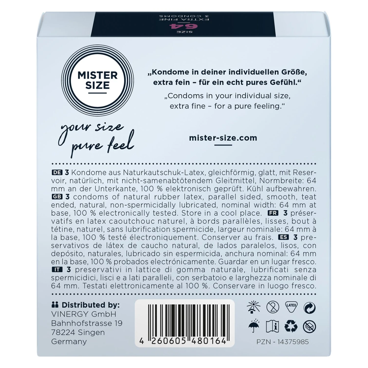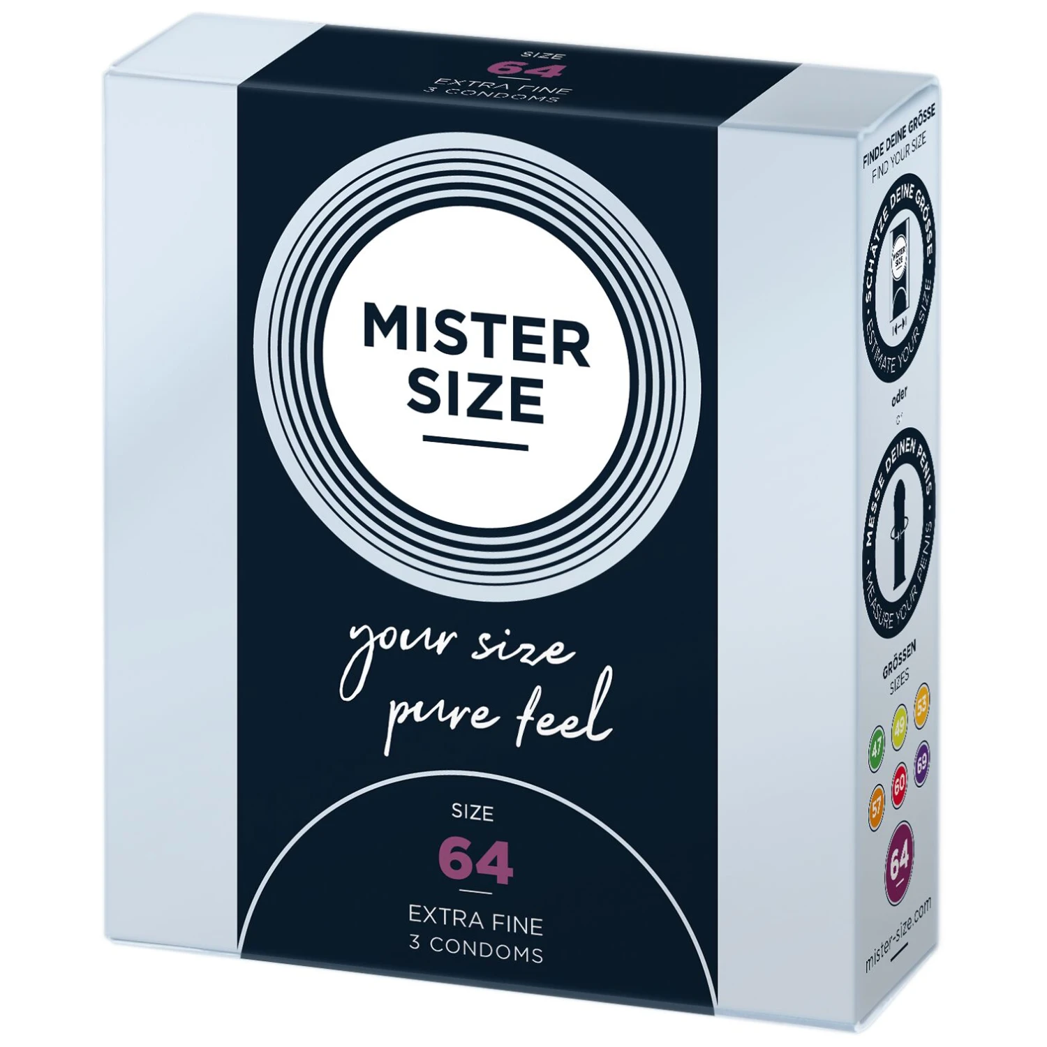 Презерватив без презерватива — только естественные ощущения во время близости! Предлагаем купить презервативы Mister Size - pure feel - 64, изготовленные из тончайшего каучукового латекса. Толщина стенок презерватива всего 0,05 мм, при этом он достаточно прочный, чтобы не порваться в ответственный момент, что обеспечивает надежную защиту от нежелательной беременности и ЗППП. Презервативы покрыты силиконовой смазкой, легко надеваются и снабжены понятной иллюстрированной инструкцией. Главное, правильно подобрать размер и наслаждаться качественным сексом!
