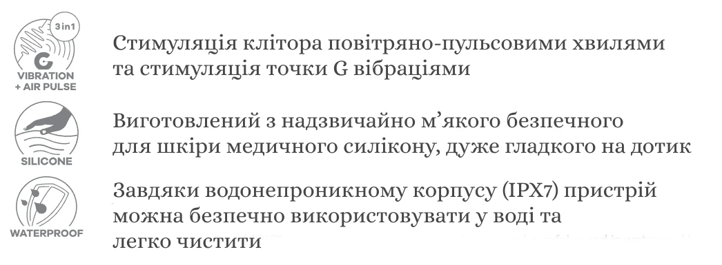 - 11 уровней интенсивности воздействия с помощью воздушных волн на клитор и целых 12 виброрежимов, которые унесут вас в мир удовольствия;