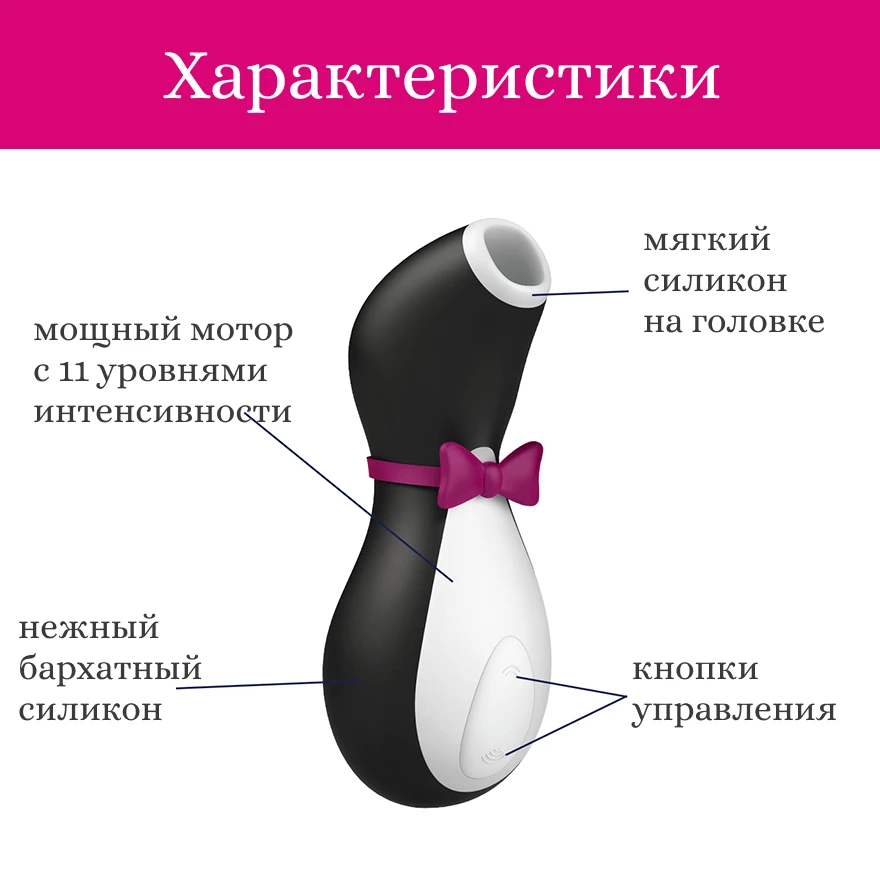 Satisfyer Pro Penguin Next Generation обладает 11 режимами интенсивности, управление которыми выполняется с помощью двух кнопок. В качестве очень крутой суперспособности, выступает его компактность. Вы сможете взять его с собой куда угодно и воспользоваться по желанию, так как он очень тихий.