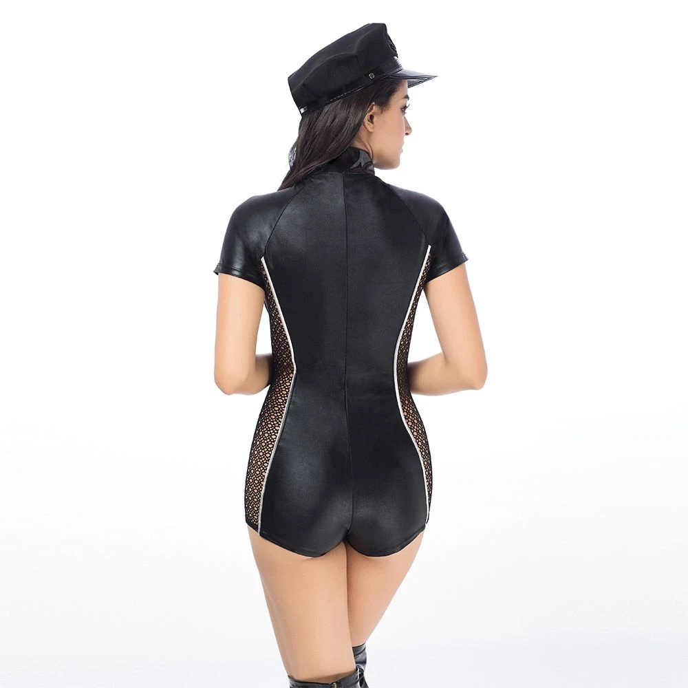Молния на комбинезоне эротического костюма полицейской Строгая Лекси позволяет его быстро снять, а кружевные вставки по бокам делают его еще более возбуждающим.