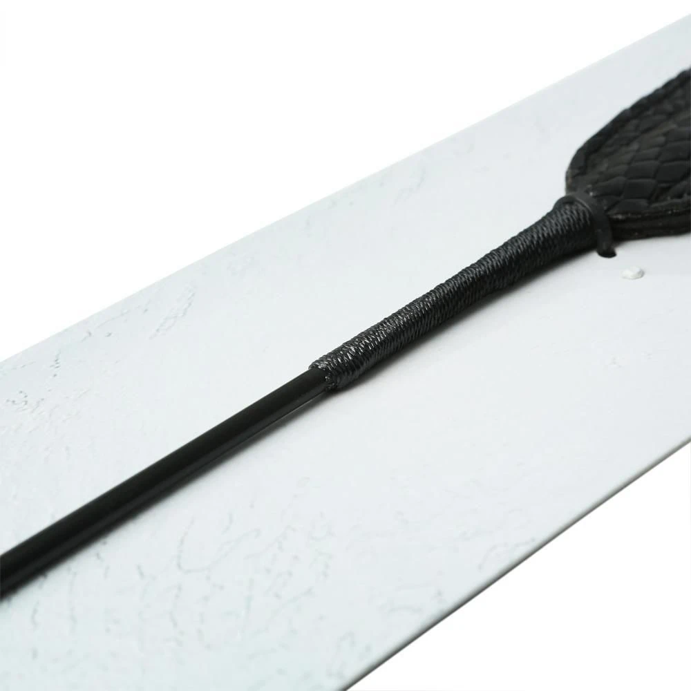 Относительно тяжелая, хорошо сбалансированная шлепалка из качественных безопасных материалов. За счет уменьшения хлопушки каждый удар будет хлестким и эффективным. Рукоять красиво отделана оплеткой под кожу и небольшими черными кристаллами, что придает шлепалке по-настоящему шикарный вид. К тому же, такая рукоятка не скользит и прочно лежит в руке для уверенного удара.
