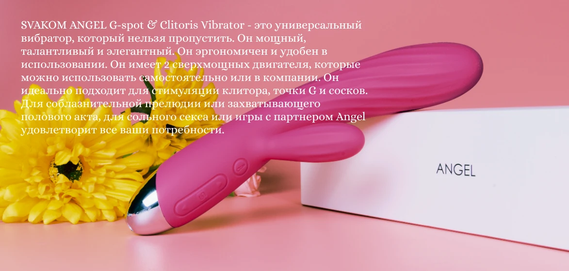 Как ангел спустившийся с небес эротического мира, вибратор Svakom Angel прибыл для ублажения вашей точки G и клитора. Он невероятно прекрасен, имеет 2 мощных мотора-сердца, максимально тихий и приспособлен к подводным приключениям. Эргономичный дизайн позволяет легко держать его в руке.