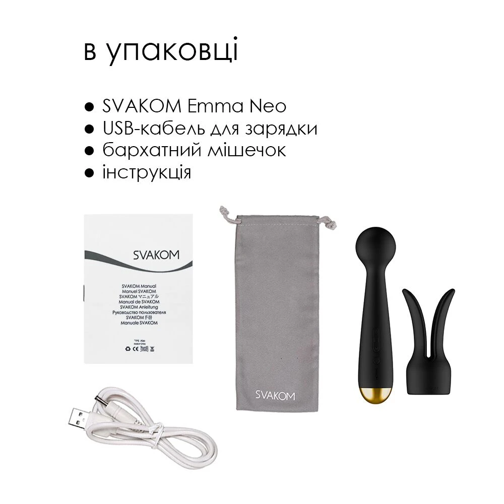 Emma Neo — это красивый и многофункциональный ванд-массажер с функцией подогрева и дистанционным управлением (по желанию) через приложение Feel Connect 3 (или 3.0 для Андроид) или используя приложение Svakom. Это чудесный вариант для массажа плеч или шеи. Удобно!
