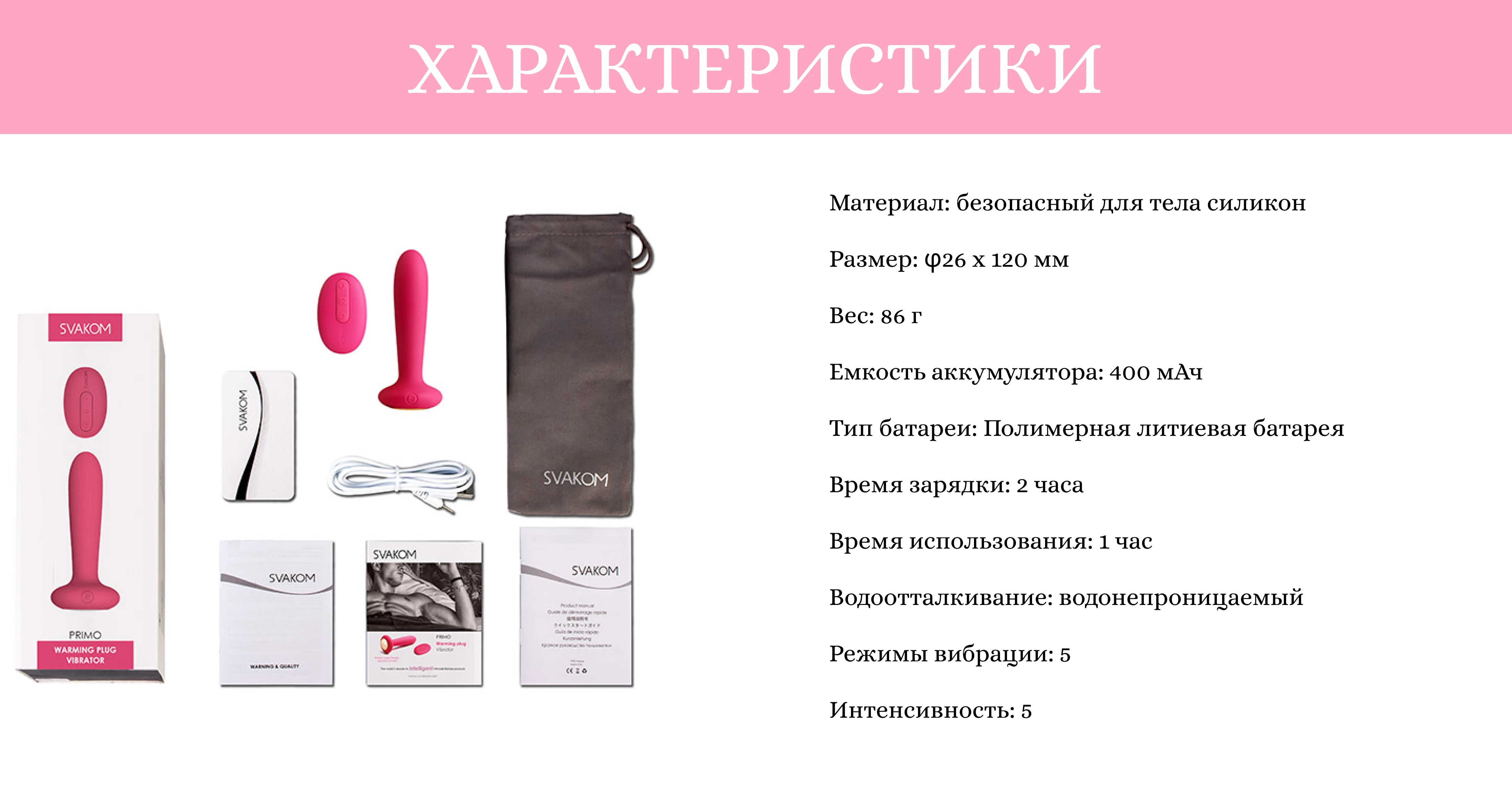 Прима занимает главное место в театре, а Svakom Primo занимает главное место в сердцах наших клиенток и клиентов. Секс-игрушку могут использовать как мужчины для стимулирования простаты, так и женщины для ублажения точки G и анального отверстия. Магическая Primo — это дистанционно управляемая длинная вибрирующая пробка-пуля.
