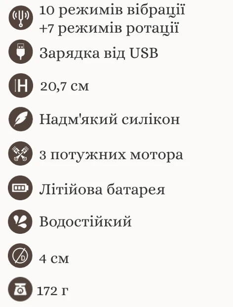 Він, як справжній джентльмен, володіє 7 режимами вібрації і 2 режимами обертання у додаткового відгалуження для стимуляції клітора.