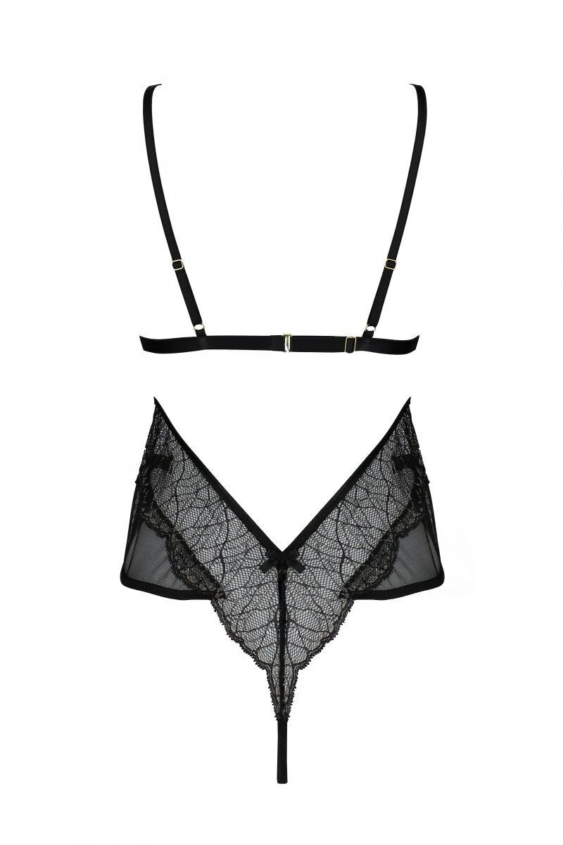 Боді Passion AMBERLY BODY характеризується оригінальним вишуканим кроєм. Трикутні чашечки ліфа з м’якого мереживного полотна підкреслюють природну красу грудей і утворюють чарівне декольте. Ще один ажурний трикутник прикриває верхню частину живота, візуально звужуючи талію завдяки вирізам на боках. Нижня частина з напівпрозорого матеріалу прикриває живіт і стегна, створюючи інтригу в образі. А на сідницях розкіш мережива переходить у тонку смужку стрінгів.