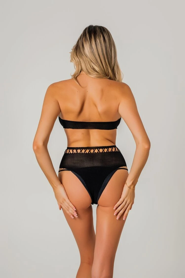 У дизайні поєднуються щільні непрозорі смуги та напівпрозора сітка. Вертикальні елементи по центру візуально витягують силует і підкреслюють талію, роблячи фігуру більш виразною.
