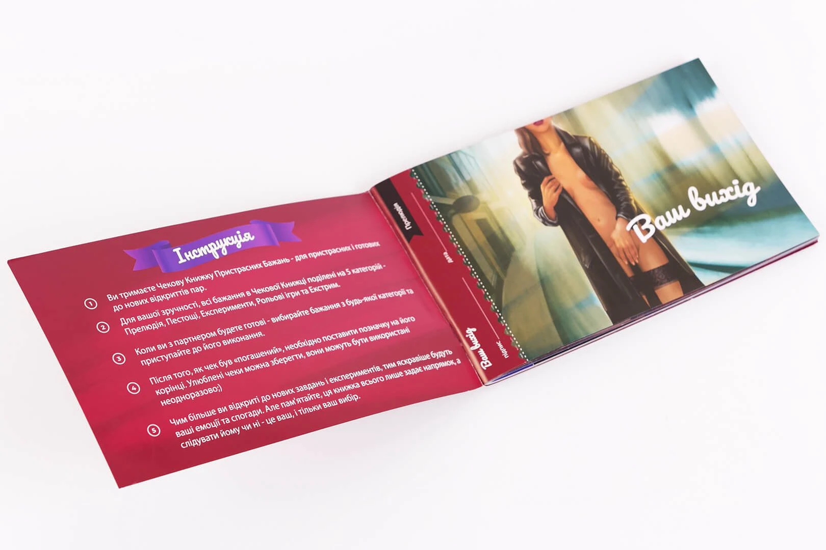 Чекова Книжка Пристрасних Бажань - це ідеальний подарунок для пристрасних і готових до нових відкриттів пар. В Книжці ви знайдете 26 чеків (завдань) різного ступеня відвертості. Поринь у світ неприхованої пристрасті — Broken Sofa.