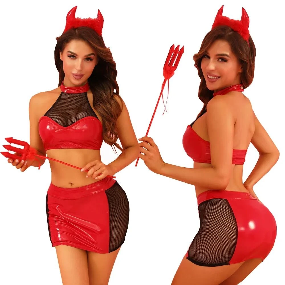 Блискуча гладенька тканина мініспідниці й топа щільно обтягує тіло, підкреслюючи спокусливі вигини фігури. Топ дуже добре підтримує груди, а завдяки коміру-халтеру спинка залишається відкритою. Верхня частина грудей прикрита чорною сіточкою. Спідниця на широкому поясі здається настільки тісною, що її хочеться швидше зняти, звільнивши гаряче тіло від кайданів тканини. Симпатичні червоні ріжки та жезл доповнюють костюм. Залиште аксесуари та доповніть костюм панчохами й туфлями на підборах — ваше надзвичайне вбрання для БДСМ-сесії готове!
