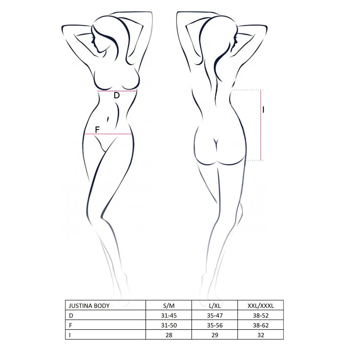 У нас ви можете купити еротичний боді Passion Erotic Line JUSTINA BODY - неймовірно сексуальна білизна з фантазійним дизайном. Особливість цієї моделі - повністю відкриті груди в обрамленні тонких бретелей. Красу і пишність грудей підкреслює ніжне чорне мереживо з напівпрозорою оборкою. Ромбовидна вставка внизу живота декорована мініатюрним бантиком. Вона плавно переходить у стрінги, тим самим зробивши основний акцент на стегнах і попі. Відчуйте себе спокусливою і бажаною у цьому еротичному боді.