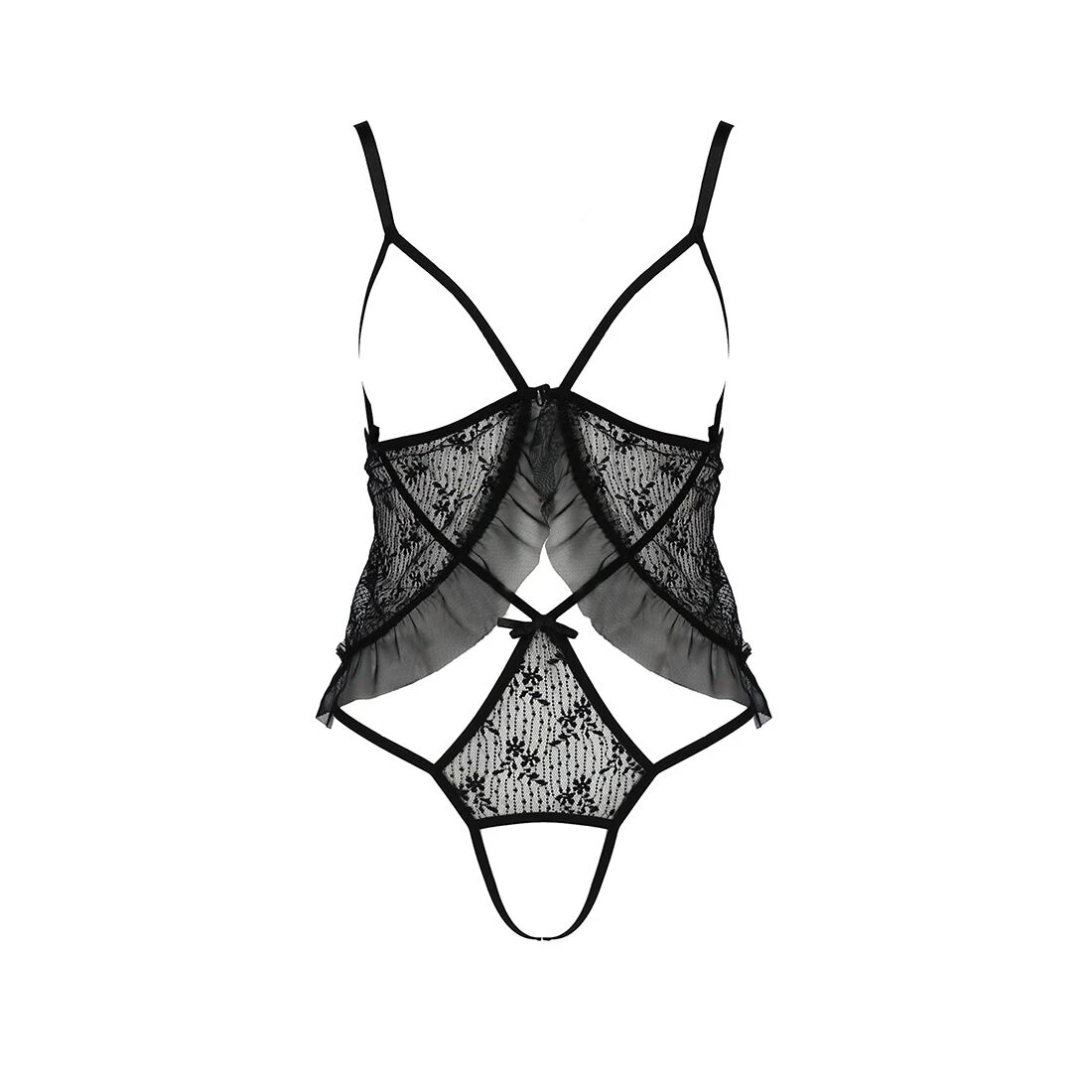 У нас ви можете купити еротичний боді Passion Erotic Line JUSTINA BODY - неймовірно сексуальна білизна з фантазійним дизайном. Особливість цієї моделі - повністю відкриті груди в обрамленні тонких бретелей. Красу і пишність грудей підкреслює ніжне чорне мереживо з напівпрозорою оборкою. Ромбовидна вставка внизу живота декорована мініатюрним бантиком. Вона плавно переходить у стрінги, тим самим зробивши основний акцент на стегнах і попі. Відчуйте себе спокусливою і бажаною у цьому еротичному боді.