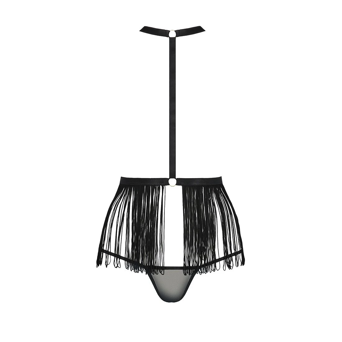 Відвертий і чуттєвий набір може стати вашою зброєю номер один у справі зваблення. По-перше, його можна надіти поверх сукні або білої сорочки, продемонструвавши свою сексуальність оточуючим. А, по-друге, його можна надіти на повністю оголене тіло і заявити про свою готовність перейти до пестощів прямо зараз! Чуттєві ремені, ефектно підкреслюють тіло, бахрома і мініатюрні стрінги зроблять ваш образ незабутнім. Ремені тягнуться і регулюються для ідеальної посадки.