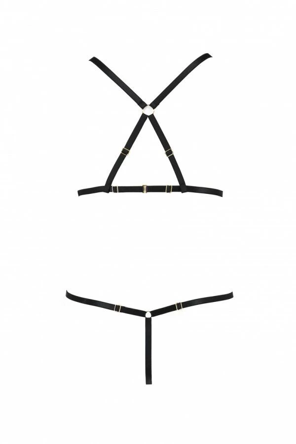 Тільки кілька ременців, що спокусливо охоплюють тіло, і нічого зайвого! Пропонуємо купити комплект білизни зі стреп ARMANDA SET black — набір для найсміливіших і гарячих. У комплект входять трусики стрінги та бюстгальтер, все складається з регульованих еластичних стрічок-ременів. Бюстгальтер можна носити і поверх одягу як портупею!