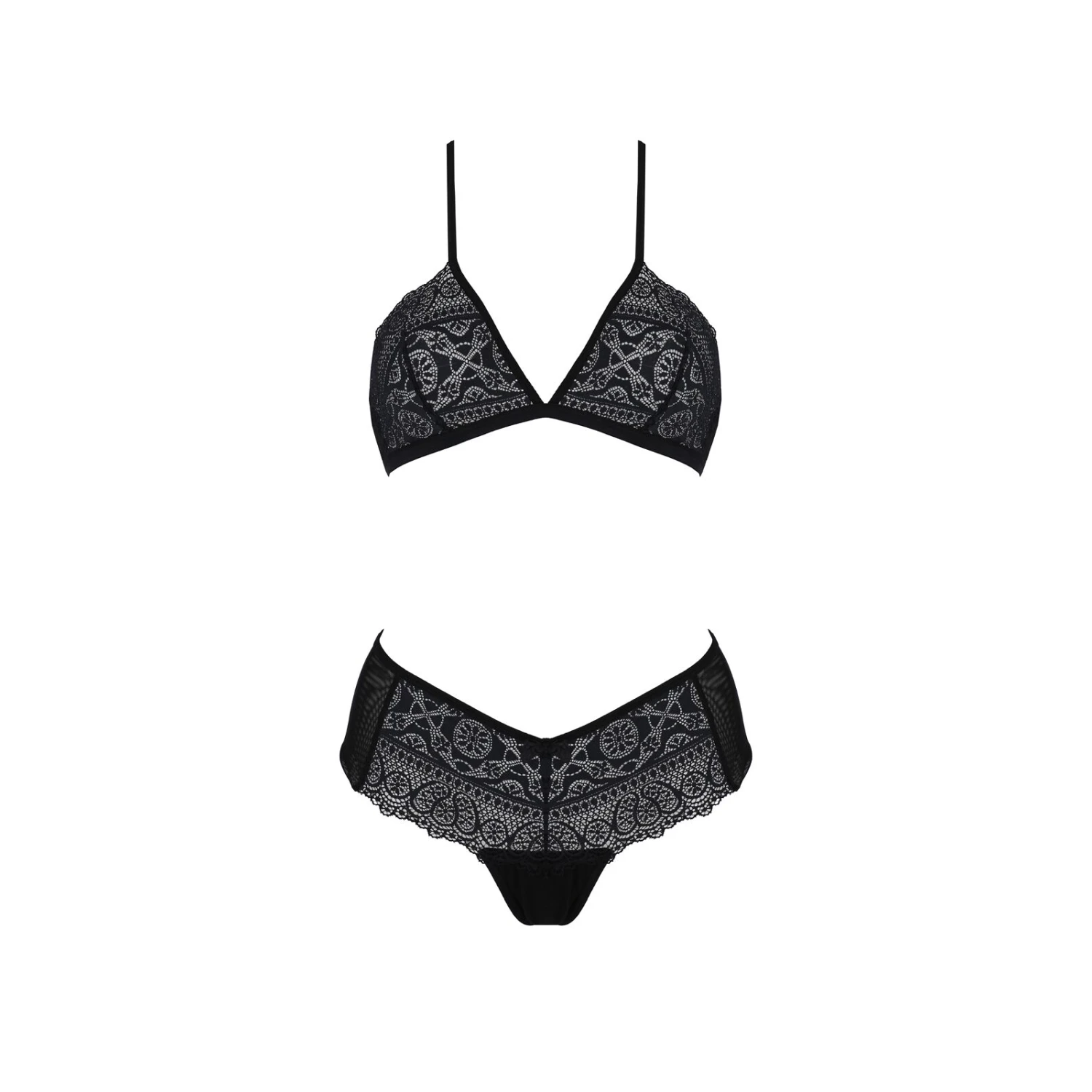Чорна еластична, м’яка на дотик сіточка в цьому сеті доповнює оксамитове мереживо з візерунком із кругів і квітів. У бюстгальтері з ажурного полотна виконані м’які чашки з виточками, а в трусиках — передня панель, що прикриває живіт.