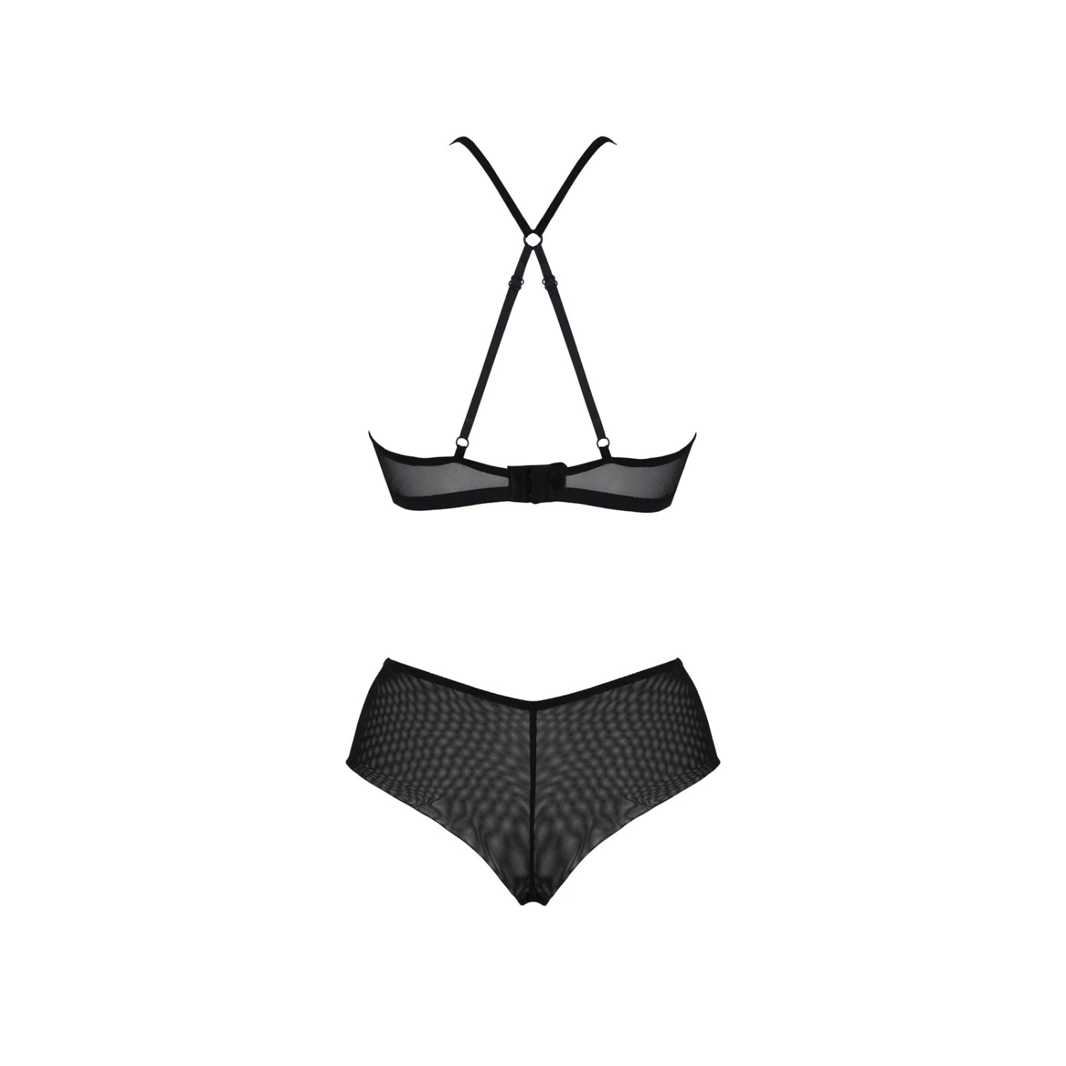 Чорна еластична, м’яка на дотик сіточка в цьому сеті доповнює оксамитове мереживо з візерунком із кругів і квітів. У бюстгальтері з ажурного полотна виконані м’які чашки з виточками, а в трусиках — передня панель, що прикриває живіт.