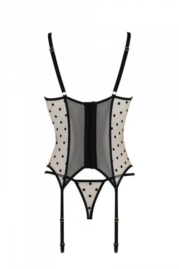 Корсет виготовлений з м’якої прозорої сіточки комбінованих кольорів — чорного та бежевого в горошок. Бігунки на бретелях допомагають відрегулювати білизну за розміром. Корсет Passion MARINA CORSET можна одягати разом із панчохами — для цього є акуратні неширокі кріплення. У наборі до корсета йдуть маленькі стрінги з бежевої в горошок сіточки.